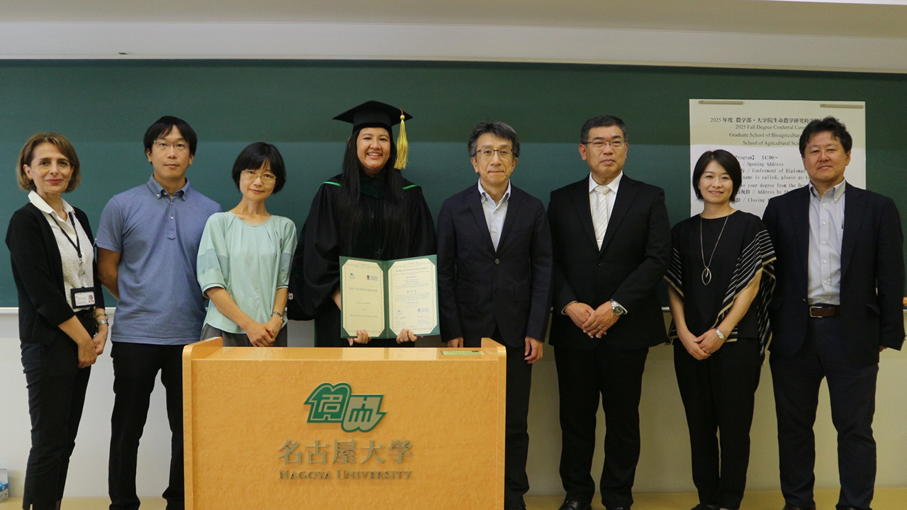 On September 29th, 2025, the Fall Degree Conferral Ceremony of the Graduate School of Bioagricultural Sciences and the School of Agricultural Sciences was held, and Ms. Um Sokheang was awarded a doctoral degree from the Joint Degree Program in Agricultural Sciences between Nagoya University and The University of Western Australia.